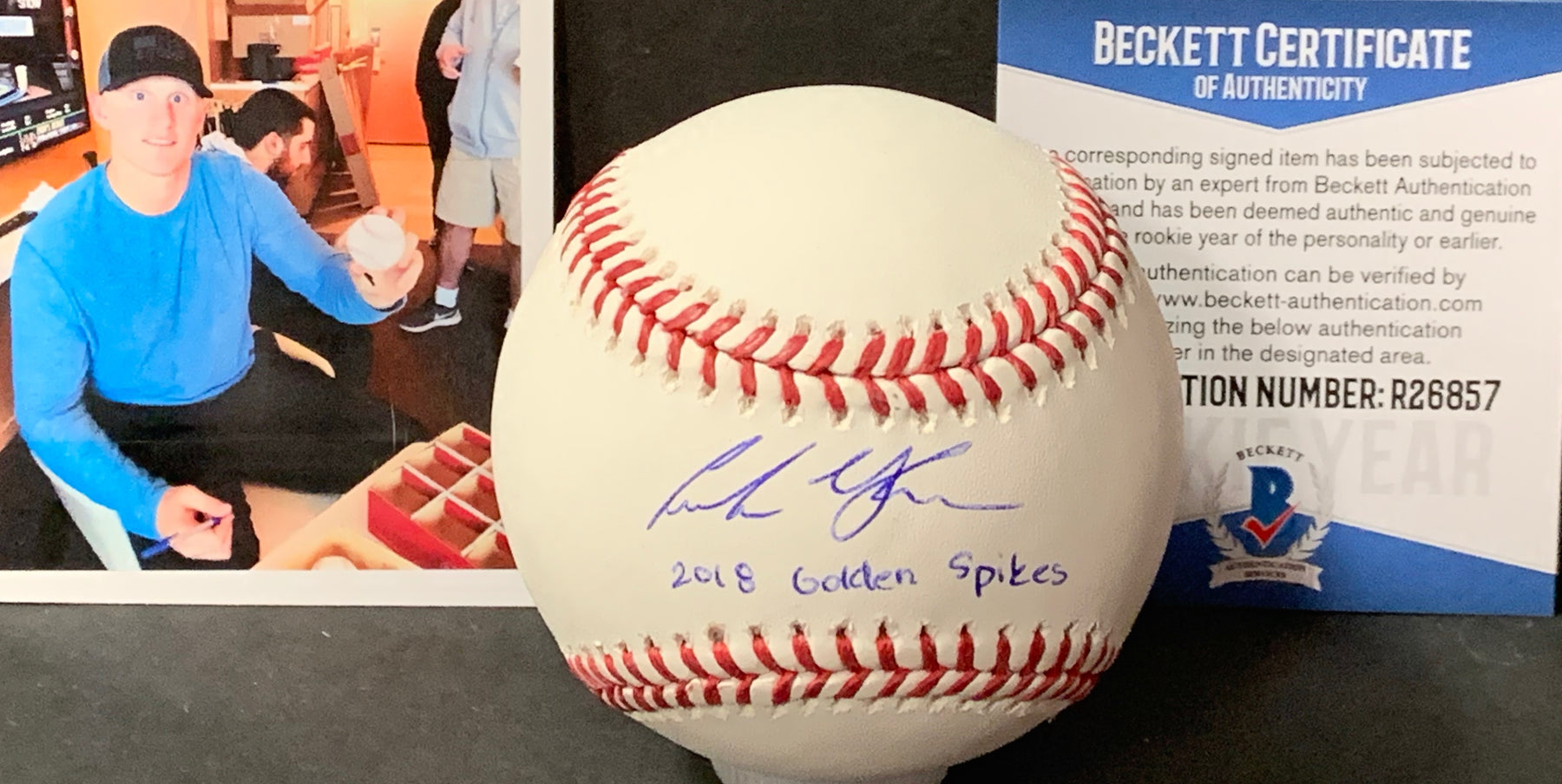 This is an Official Major League Baseball that Andrew signed at a private signing. Andrew added 2018 Golden Spikes to the baseball. We show a picture of Andrew from the signing, you will also receive this proof picture. This item will come with a Beckett WITNESS COA. Beckett WITNESS is a great COA as it guarantees the item to be authentic as a Beckett employee was present at the signing. We use stock photos.