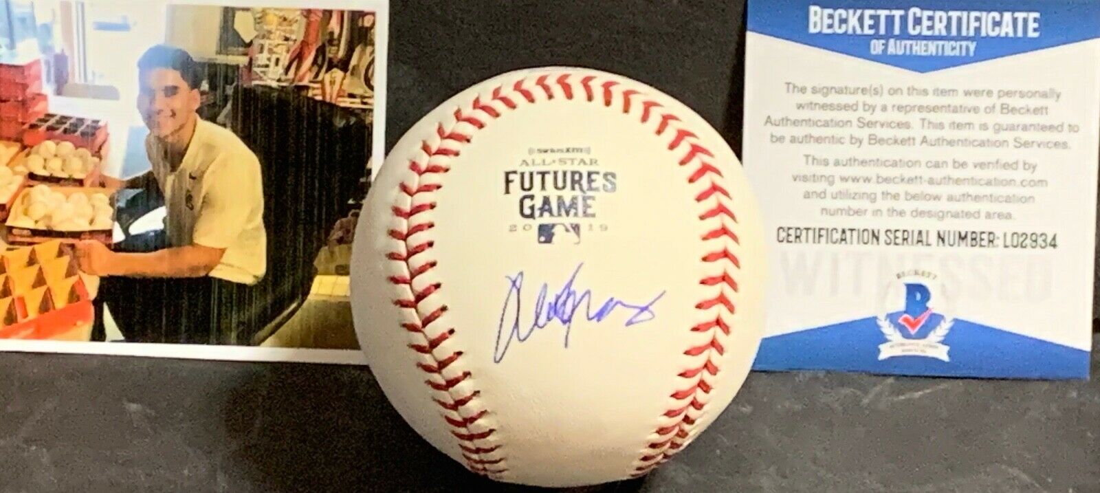 This is an Official 2019 Futures Game Baseball that Alek signed at a private signing. We show a picture of Alek from our signing, you will also receive this proof picture. This baseball comes with a BECKETT WITNESS COA. This COA guarantees this item to be authentic as a Beckett employee was present when the item was signed. Beckett is the leading authenticator in our industry! We use stock photos.